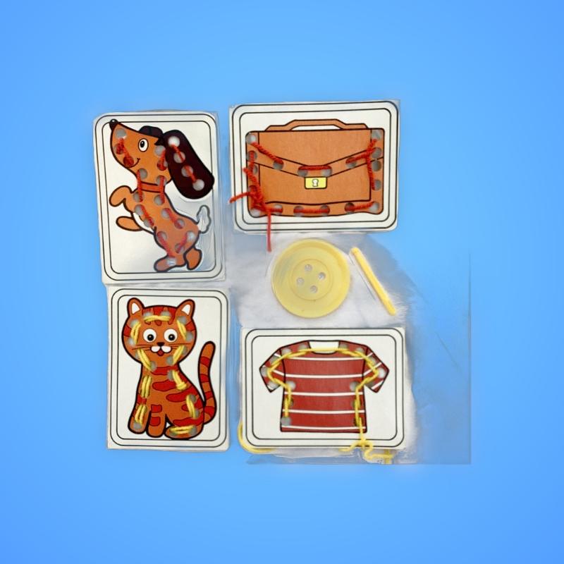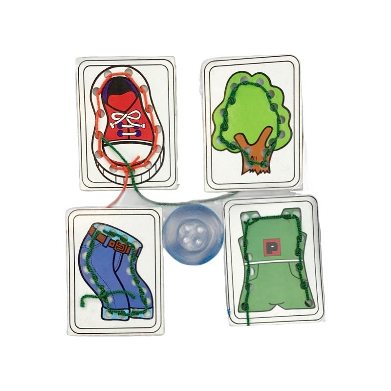 A set of cheerful lacing cards with a chunky practice button for calm, hands-on fine motor play. Children thread the cord through pre-punched holes to outline friendly pictures and practise neat stitches.