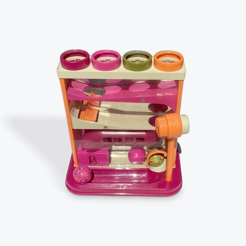 A colourful pound-and-roll activity from B. toys. Little hands place the balls in the top rings and tap with the hammer to send them racing down the ramps, turning simple cause-and-effect into satisfying, noisy fun.