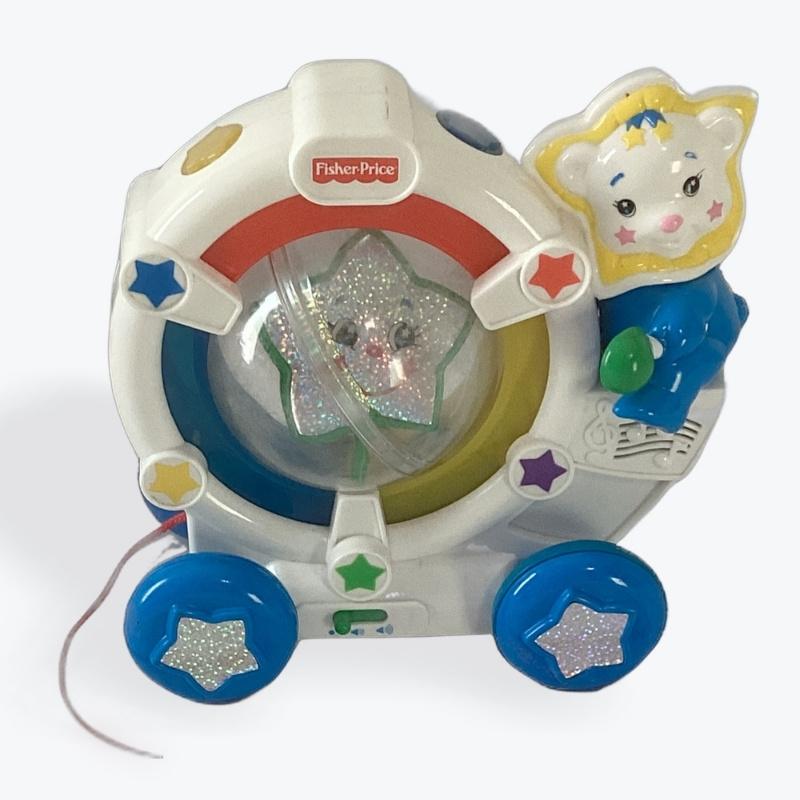 A vintage Fisher-Price pull-along drum that plays gentle tunes as it rolls. A friendly bear rides along while a glittering star spins in the clear drum, adding light-catching sparkle and sensory interest for little explorers.