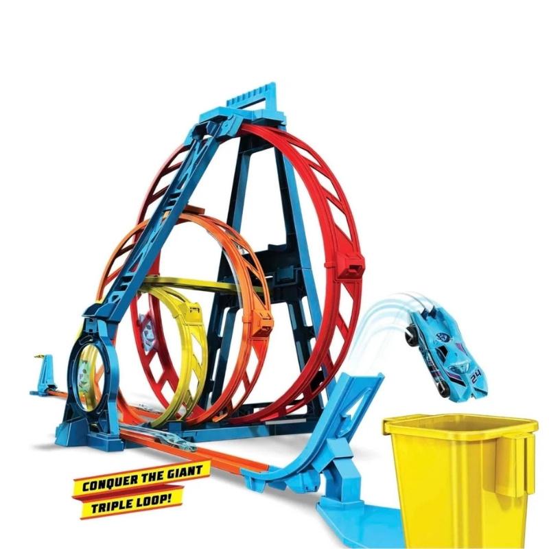 Hot Wheels Track Builder Unlimited set with a giant triple loop, gravity drop and jump ramp for high-speed stunts. Kids design layouts, test momentum and race for big air, then rebuild for new challenges.