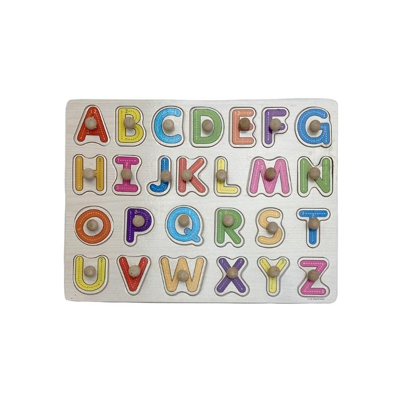 Lift and match all 26 letters with this sturdy wooden tray puzzle. Chunky pegs make pieces easy to grasp, while the printed outlines guide successful matching and encourage early sound talk and letter naming in everyday play.