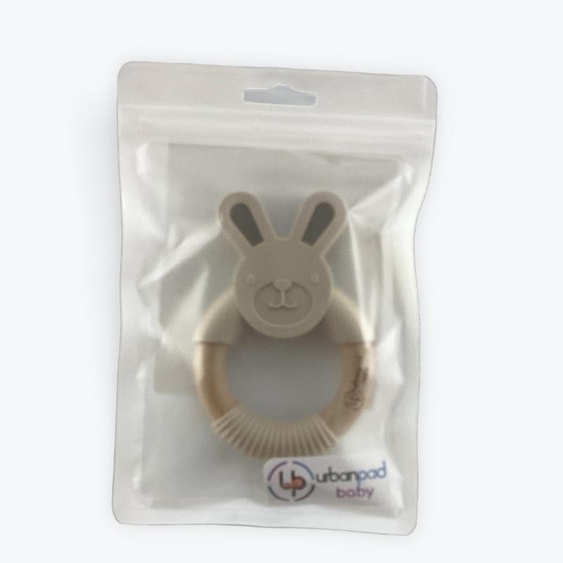 Silicone-and-wood teether shaped like a friendly bunny, with an easy-grip ring and soft textures for soothing gums. Neutral tones suit any kit, and the compact design slips into nappy bags for calm, on-the-go comfort. Brand new in packaging.