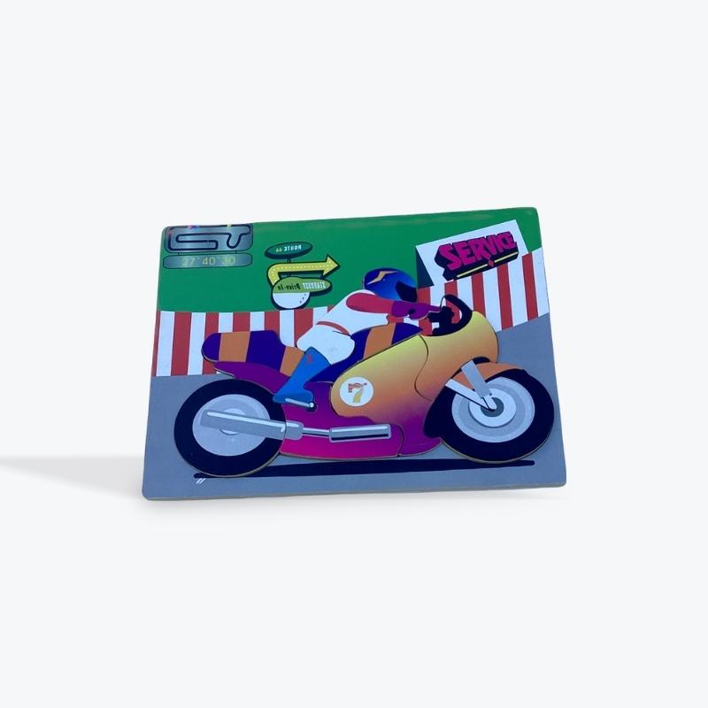 This bright wooden tray puzzle celebrates the speed and curves of a racing motorcycle. Large, easy-grip pieces lift out and press back with a rewarding click, inviting repeat solves that feel engaging rather than frustrating.