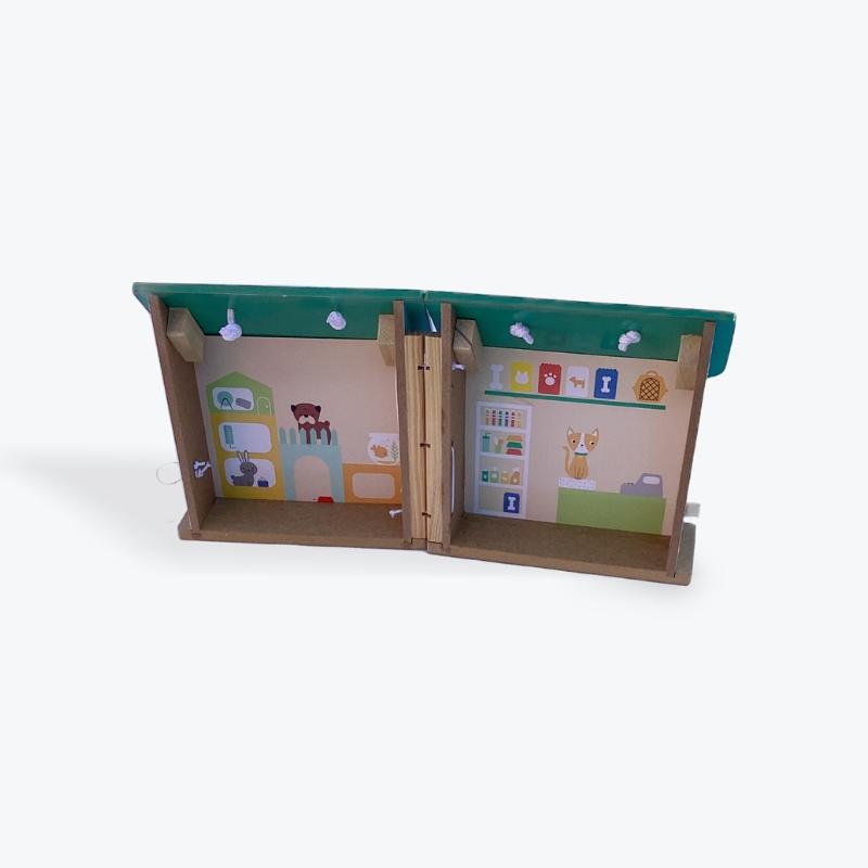 Foldable wooden pet shop with printed scenes and sturdy carry handles. Opens out to create an instant setting for small-world adventures about pets, care and community helpers.